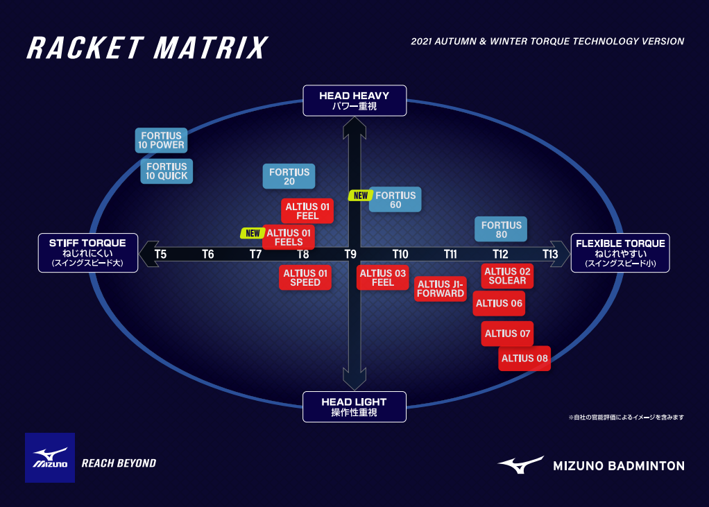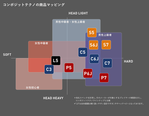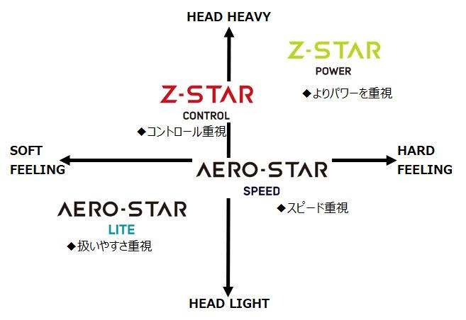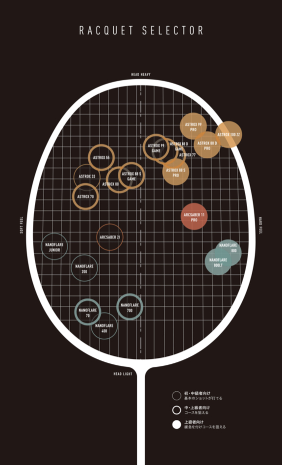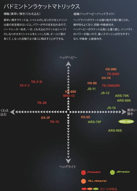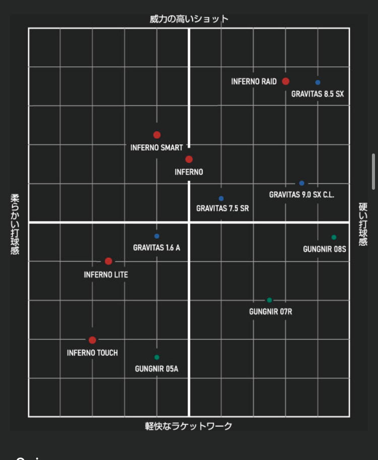 まずすべてのメーカーで言えることなのですが、 縦の軸(上下)でバランス(ヘッドヘビー↔ヘッドライト) 横の軸(左右)で打球感(スピード)(硬め(弾き重視)↔やわらかめ(ホールド重視)) を表示しています。 そのため、一概に右上が使いやすい訳ではありません。 ただし、男子の上級モデルは右上に多い傾向があります。