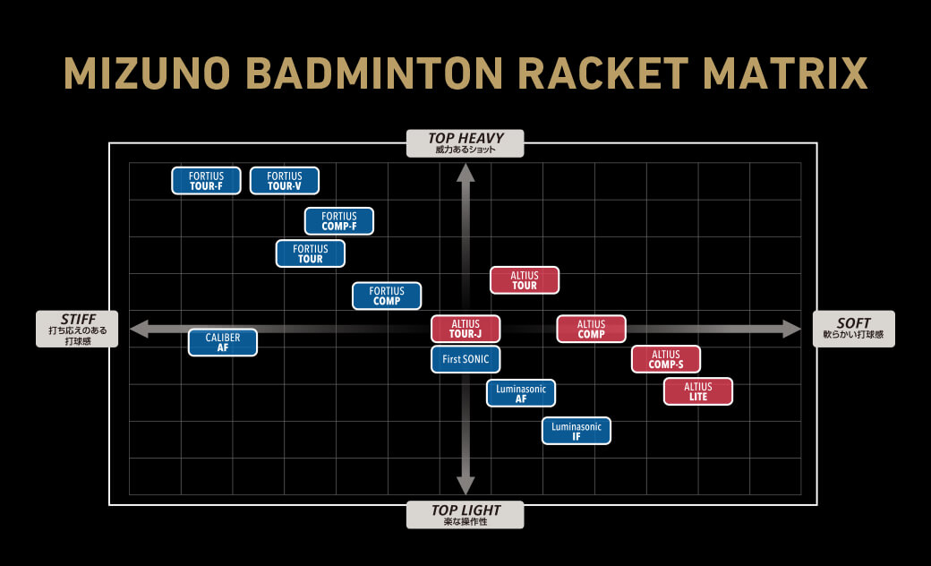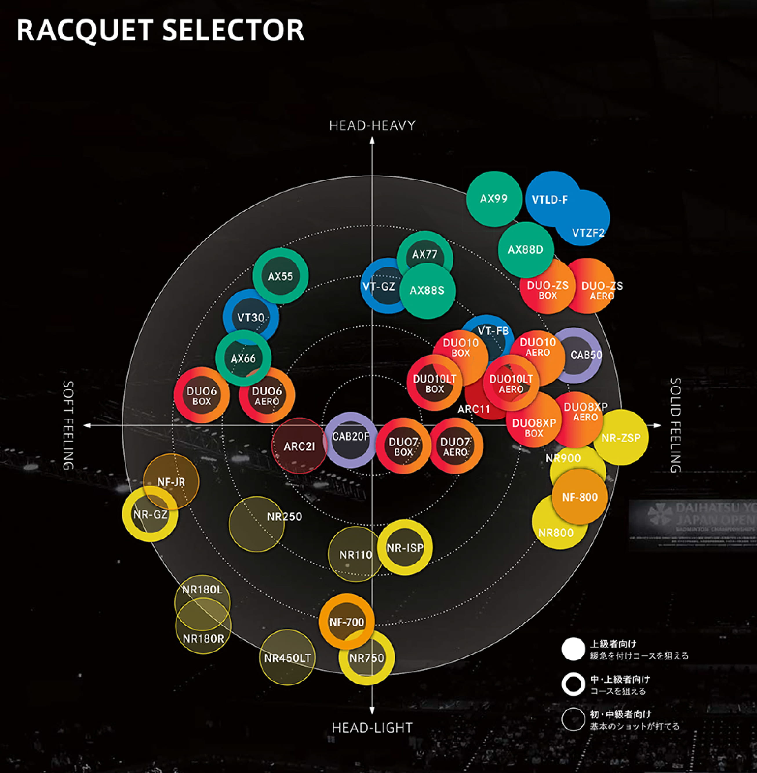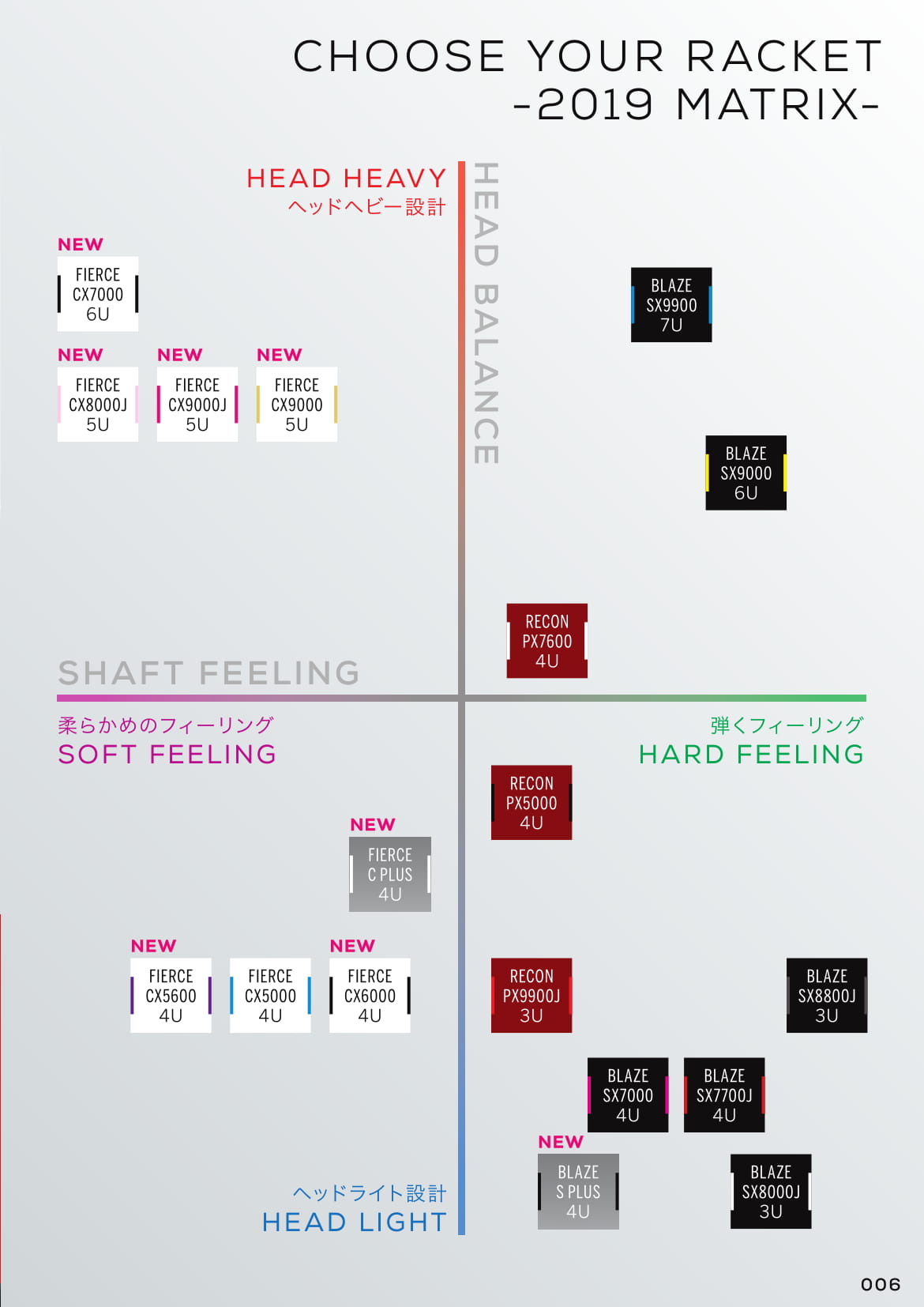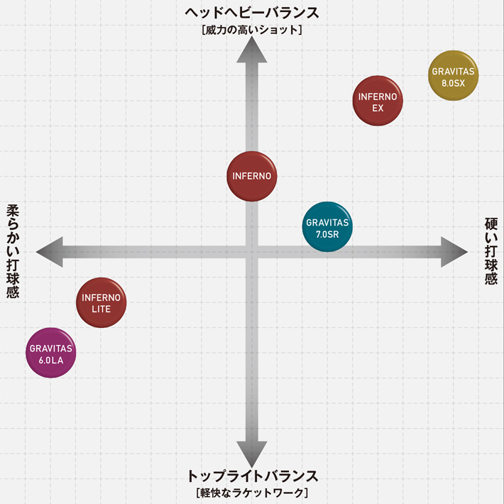 全体のラインナップとしても、満遍なく用意しています。ただし、ラケット重量などもかなり異なると思いますので、実際に使ってみると印象が違うかもしれませんね。