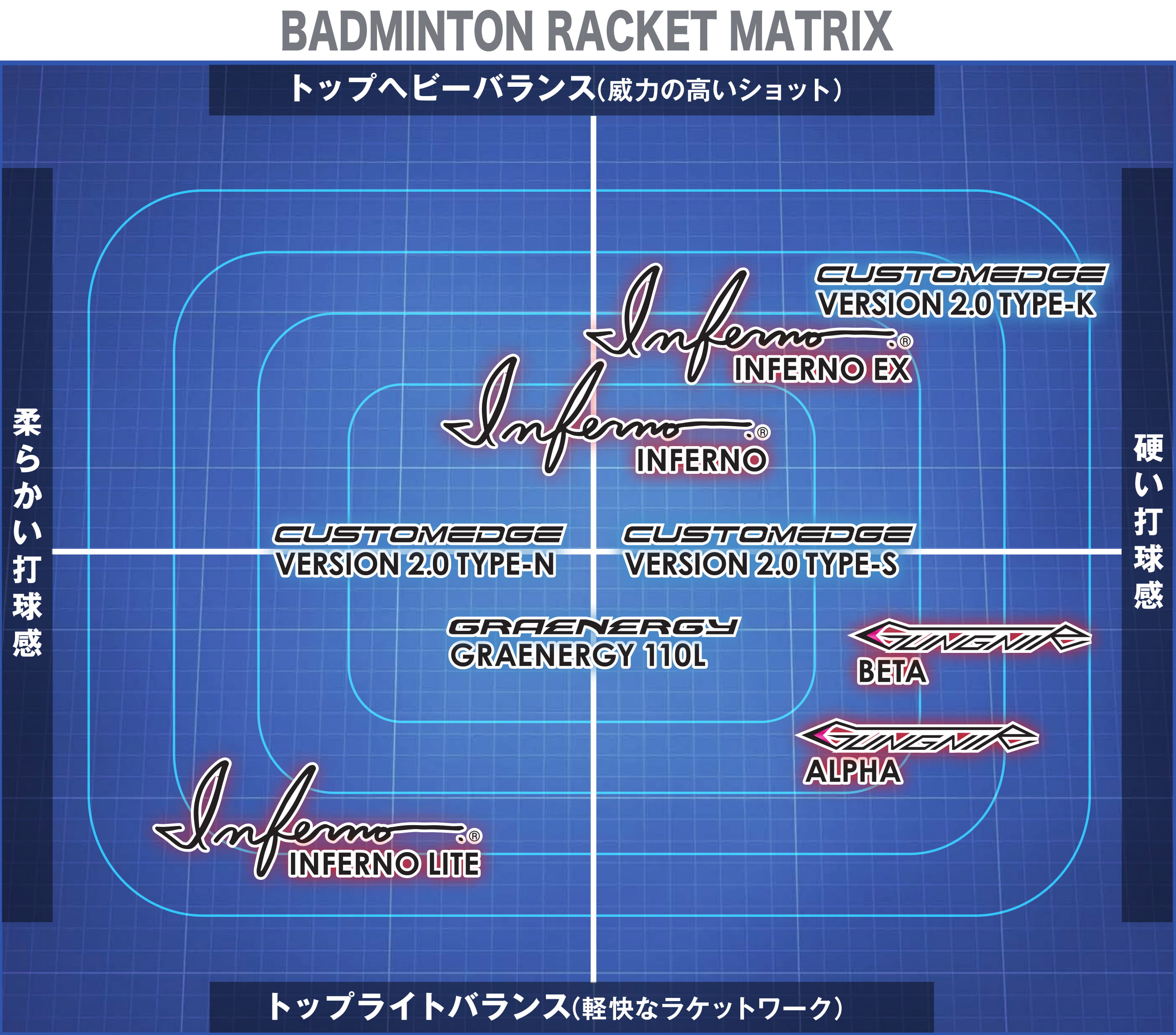 ゴーセンは、グラビタスの打球感やインフェルノの特徴的な形状、グングニルの長さなど、面白いコンセプトのラケットを多数出していますが、バランスの良いスペック構成ですね。傾向としては、ヘッドヘビーなラケットは硬く、ヘッドライトなラケットは柔らかいラケットとなっています。