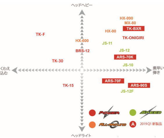 縦の軸(上下)でバランス(ヘッドヘビー(パワー重視)↔ヘッドライト(スピード重視))を、